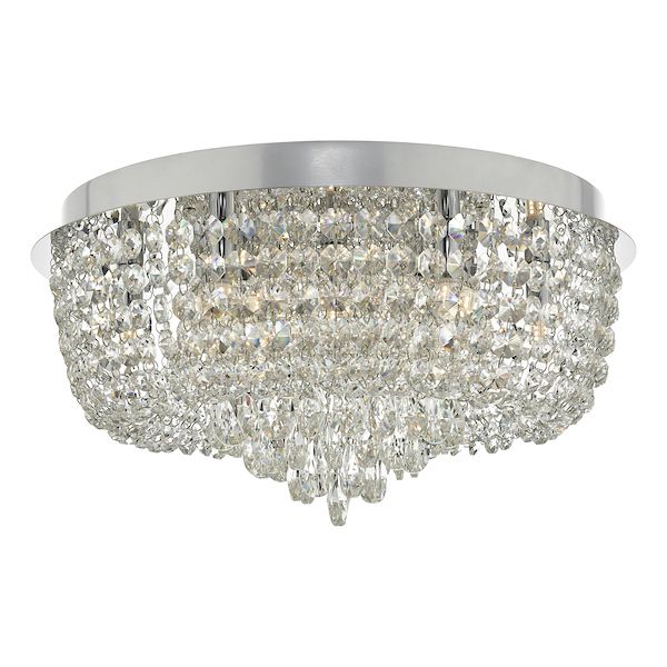 The Eitan 9 light beaded flush clear and polished chrome is a flush ceiling light with 9 lights and is finished in crystal and polished chrome. Part of the Dar Eitan range, it has a G9 lamp holder and requires 9 G9 bulbs. It's dimensions are 250mm height x 500mm diameter.