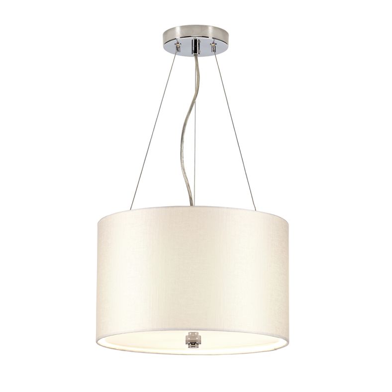 This pendant with suspension wires is available in stock with a faux silk Ivory shade. Choose from 6 different size options with either a Polished Chrome or Aged Brass Ceiling pan and finial. A gloss white acrylic bottom diffuser is included. See our shade catalogue for more shade colours and customised option.