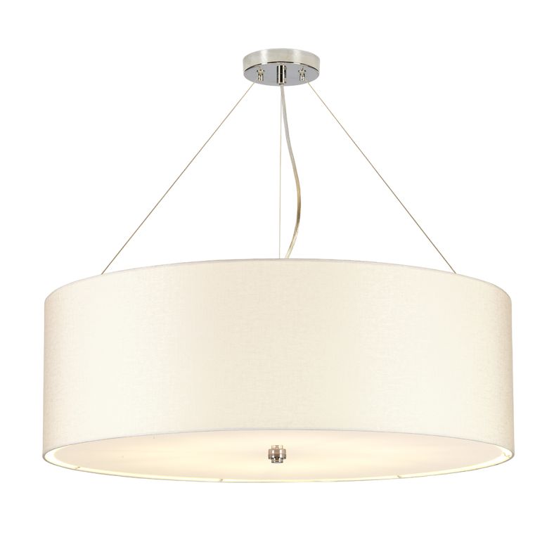 This pendant with suspension wires is available in stock with a faux silk Ivory shade. Choose from 6 different size options with either a Polished Chrome or Aged Brass Ceiling pan and finial. A gloss white acrylic bottom diffuser is included. See our shade catalogue for more shade colours and customised option.