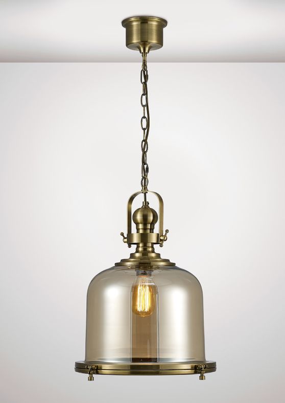 Diyas IL31595 Riley Single Large Bell Pendant 1 Light E27 Antique Brass/Cognac Glass