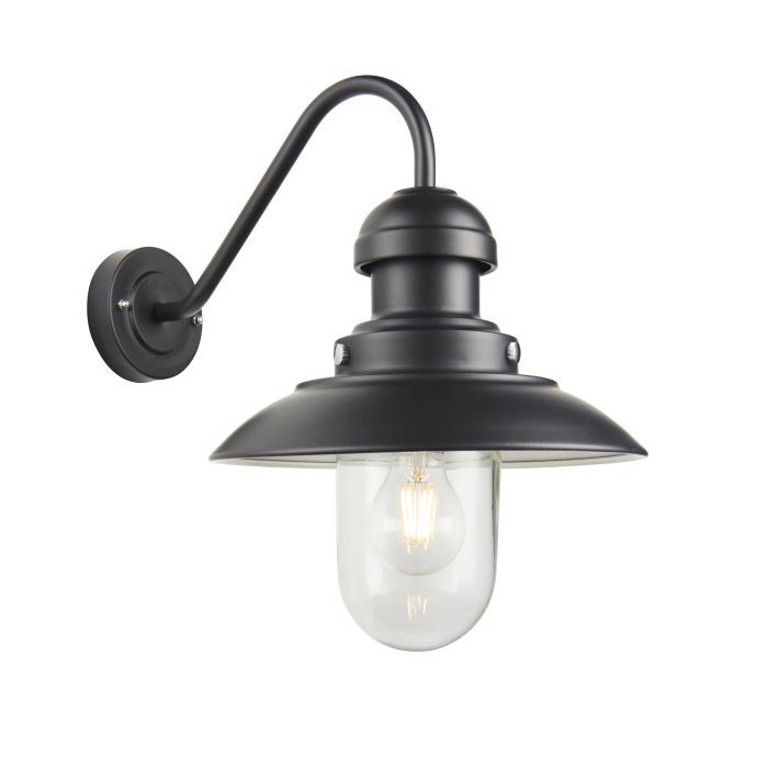Modern traditional exterior wall light with textured black finished metalwork and curved fisherman's arm. Clear glass shade perfect for use with E27 LED filament lamps. IP44 rated for safe exterior use.