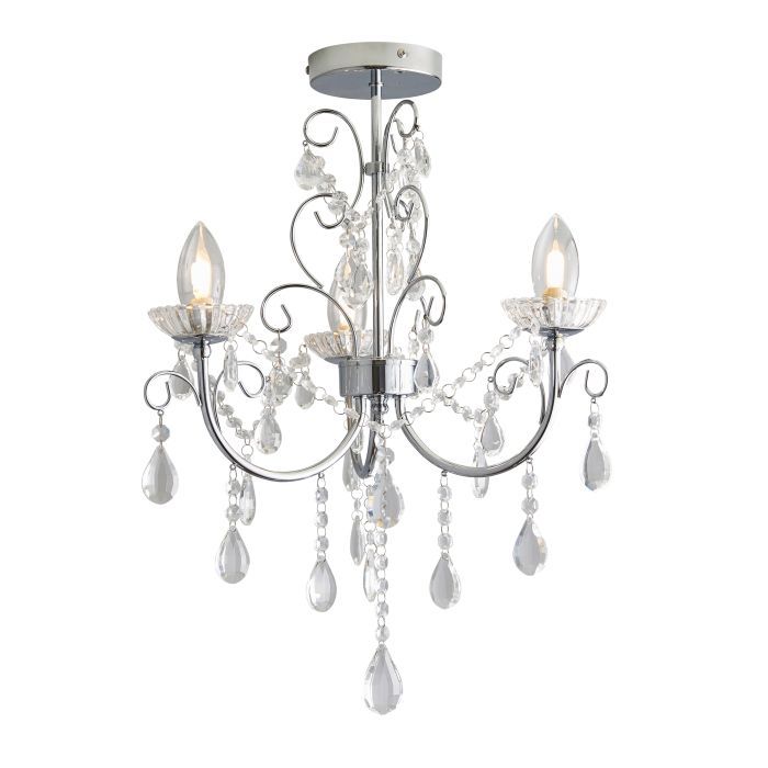 The Tabitha 3 light semi flush ceiling fitting is finished in a chrome effect plate with clear crystal glass detail and droplets. IP44 rated so suitable for use in the bathroom, dimmable and suitable for use with LED lamps. Matching items available