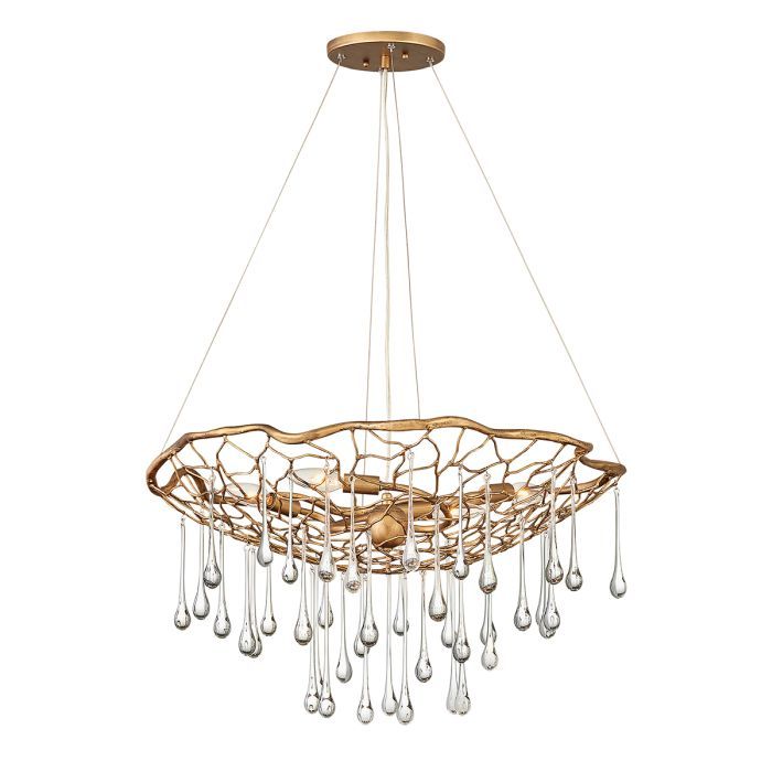 Imagine a net gently breaking the surface, then slowly emerging with a cascade of water droplets trickling through and shimmering with light. Laguna uses a hand-made open framework design in Brushed Gold as the foundation in this artistic interpretation. Clear glass droplets fall at varying lengths, casting the light. Minimal hanging wires ensure the net itself appears to float, as a candle cluster emits light from within.