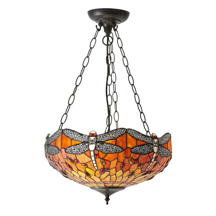 A stunning inverted pendant with the iconic Tiffany Dragonfly design in a vibrant oranges and reds, with glass beading a dark bronze effect fitting. Dimmable and compatible with LED lamps