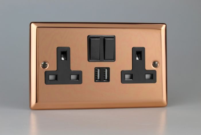 Varilight Polished Copper 2-Gang 13A Single Pole Switched Socket + 2x5V DC 2100mA USB Charging Ports (XY5U2SB.CU)