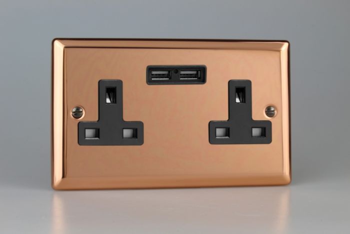 Varilight Polished Copper 2-Gang 13A Unswitched Socket + 2x5V DC 2100mA USB Charging Ports (XY5U2B.CU)