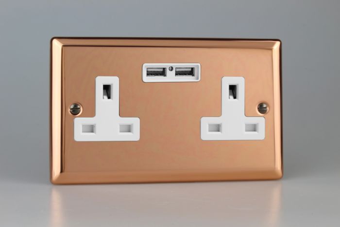 Varilight Polished Copper 2-Gang 13A Unswitched Socket + 2x5V DC 2100mA USB Charging Ports (XY5U2W.CU)